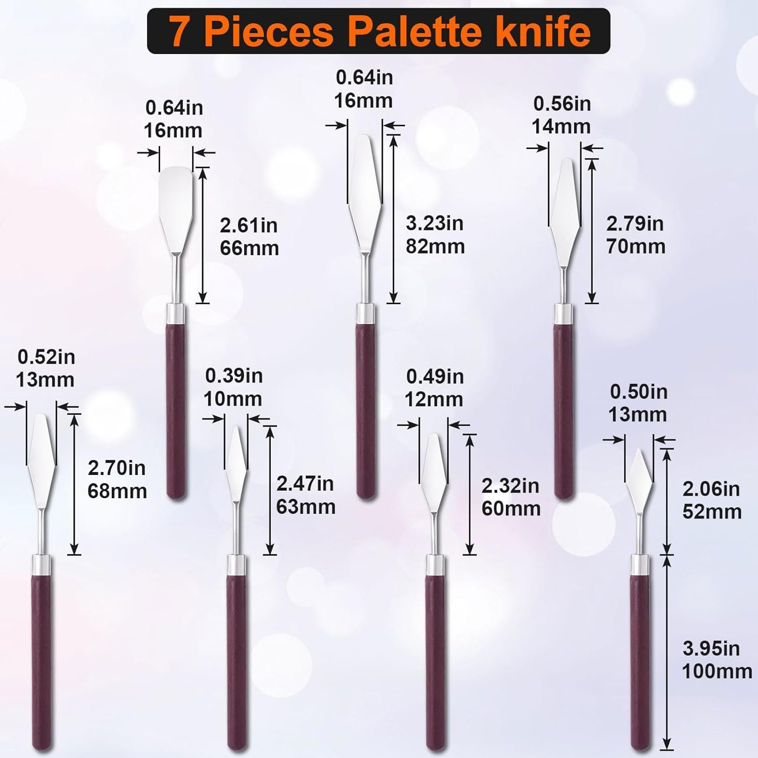 - Package Included: You will get 7pcs palette putty knife in 7 shapes. The different shapes and sizes can meet your diverse needs of use and painting. You can use this paint knife to design flowers or spread cream on cake.
